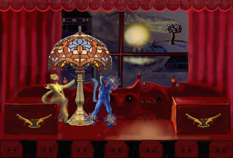 Kitti Kahuna, a long haired, Golden Persian kitten, lives alone on her mantlepiece until a vagabond, Irish rat, Jack O'Majori happens by. He introduces Mango Milli, Eboni Elle, then, the three KITTINS and Jack perform a clever routine.